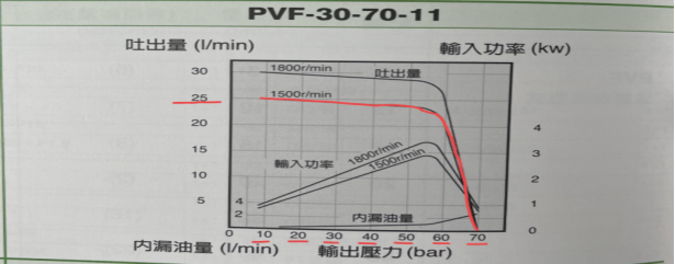 (注意事项:PVF-30系列是变量压力补偿,压力越高,吐出量越低;压力越低,吐出量越高;内泄小,效率高的原理。压力调节范围是:0-70kg之间,按国内电机转速均在1500的计算,压力在10kg的时候,吐出量是25(l/min),压力在20-30kg的时候,吐出量是24(l/min),压力在40-50kg的时候,吐出量是23(l/min),压力在60-70kg的时候,吐出量是2(l/min),性能图附上,可对应参考。