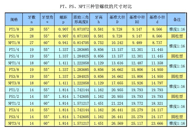 压力表常用螺纹大小比较